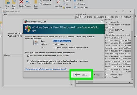 Run the server program again. If the Windows Firewall window appears, click the Allow access button. More files will be created in the Minecraft Server field. Close the server window for now as you make some more changes.