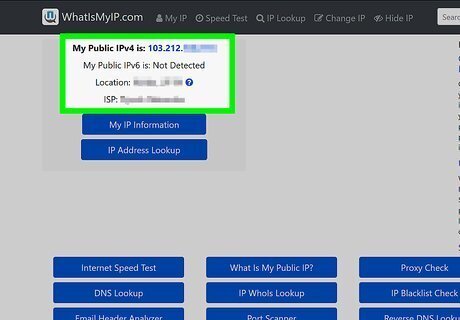 Open Google on the server computer and type .my ip. Your computer's public IP address will be displayed above the search results. Copy this address or write it down. Give it to your friends to use to connect to the server. Note: If you have a dynamic IP address (most people do), your IP address will change occasionally. When it does, you'll need to give out the new IP address to your friends so that they can connect again. You can avoid having to do this in the future by setting up dynamic DNS. This usually requires setting up a paid account with a service that will automatically forward users who enter your domain name to your active IP address.
