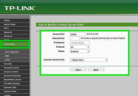 Forward port 25565 so that others can connect. Your basic server is up-and-running, and your friends have been added to the white-list. You'll now need to configure your router to allow them to connect to the server and access the game. This requires forwarding a port. Log into your router's configuration tool. This can usually be accessed from your web browser by entering the address 192.168.1.1, 192.168.0.1, or 192.168.2.1. The address may be different for your router model. You'll need to enter the router administrator's username and password. Check your router's documentation for the default login info if you never changed it. Open the Port Forwarding section of the router configuration page. This may be in the Advanced or Admin section. Create a new rule using the server computer's local IP address. Forward port 25565 for both TCP and UDP.