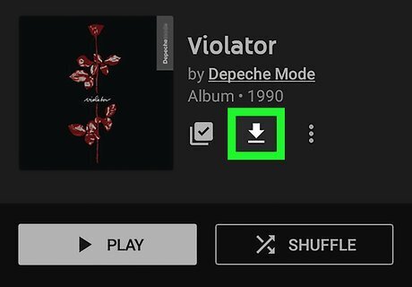 Tap the download Android 7 Download icon. The download icon resembles an arrow point down with a line below it. It's below the album or playlist title at the top of the song list. It may take a moment for the entire album or playlist to finish downloading. When it is finished downloading, the Download icon will turn into a checkmark. You can also download an album or playlist by tapping the button with three vertical dots (⋮) across from the album or playlists. This displays a pop-up menu. Tap Download in the pop-up menu.