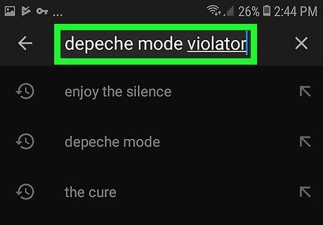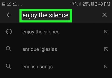 Search for a song. To search, tap the magnifying glass icon in the upper-right corner and then type the name of a song in the search bar. You can also browse recommendations in the Home tab in the lower-left corner of the YouTube Music app. If you have music in your library, you can tap the Library tab in the lower-right corner of the YouTube Music app. Read "How to Use YouTube Music on Android to learn more about how to search for music and use your library.