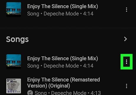 Tap ⋮ next to a song. If you search for music using the magnifying glass icon, songs are listed under "Songs". If you have liked any songs, they can be found under "Liked Songs" in your Library. You can also view all the songs on an album or playlist by tapping on the album or playlist.
