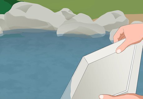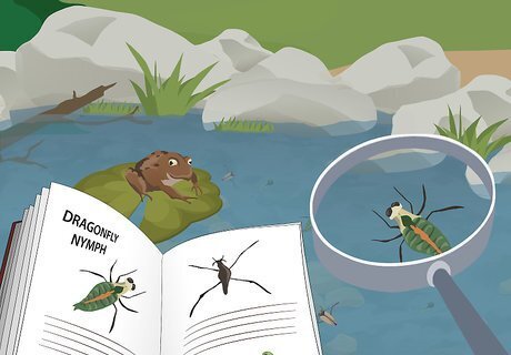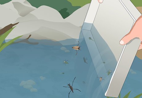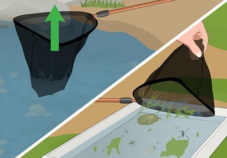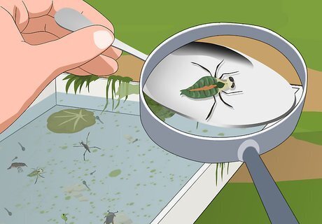 Fill the tray with some pond water. Create a mini pond environment for your critters to swim around in while you look at them. Use the tray to scoop up some pond water and set it on a flat spot on the ground. This gives the specimens a place to move around while you observe them.