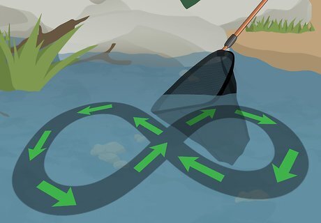 Swirl the net in a figure-eight motion. Move the net slowly through the water so you don’t stir up too much mud from the bottom. A figure-eight motion helps you catch creatures as they flee when they feel the water move. You want to get as many little pond friends as you can. Swirl the net in a figure-eight a few times. You’ll pick up some vegetation and pond-slime, which is okay. Within all of that, plenty of creatures will be hiding.