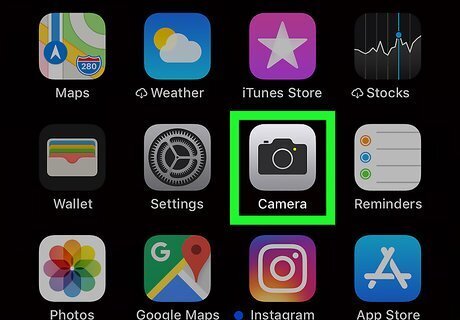 Tap the Camera app to open it. The Camera icon looks like a black camera on a grey background. If you can't find the Camera app, swipe right on your home screen and type "Camera" in the search box at the top of the screen. Tap the Camera icon from the search results.