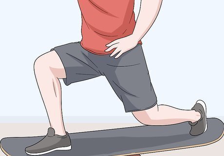 Try doing lunges on a balance board to challenge your balance. Stand on a balance board with one foot in front of the other. Bend your knees so that the front foot is directly under your knee in a lunge position and try to become balanced so that the board isn’t moving around. Stretch your back leg out if desired and switch feet after a few seconds to strengthen the other leg as well. To make this exercise harder, try holding weights in each hand over your head as you do your lunges. Since you'll often be in a lunge-type position while wakesurfing, this is a great way to help you practice.