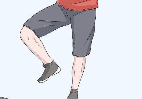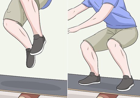 Jump up and land carefully on a training surface to work on your balance. If you've never done this before, it's best to start out jumping on an even surface before working your way up to a balance board. Stand on the floor or a balance board with your feet shoulder-width apart and your knees slightly bent. Jump straight up and try to bring your knees as far up as possible before landing back on the floor or board with your knees bent. Try to do as many jumps while landing softly as you can within a minute. Be careful when jumping on the balance board, as landing incorrectly might cause an injury. This exercise is great for training you to keep your balance if you do tricks while wakesurfing. Avoid looking down at your feet as you’re doing the jumps.