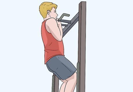 Use a pull-up bar to do pull ups or arm hangs to strengthen your arm muscles. Use a pull-up bar that attaches above a door frame or visit your local gym to use their pull-up bar. Hang from the bar with both arms extended and try to lift your body up so that your head is above the bar to do a full pull up. If you can't do a pull up, no worries! Hang for a few seconds from the bar to strengthen your arm muscles. See if you can hang from the bar for 10-20 seconds before letting go. This exercise will help build your shoulder and arm strength while increasing your range of motion.