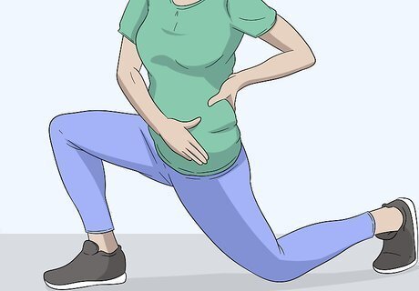 Move into a lunge and rotate your torso to stretch your core and sides. With one foot positioned in front of the other, bend your knees so the front foot is directly under your knee in a lunge. Stay in the lunge position and move both of your arms to the left side as you twist your torso to the right. Switch and slowly move your arms to the right side while you twist your torso to the left, stretching out your body. Your body will do a lot of twisting while you're wakesurfing, making this a useful exercise to practice. Stretch to the left and right sides at least 5 times while staying in the lunge position. Switch feet positions and change your front foot halfway through your stretch.