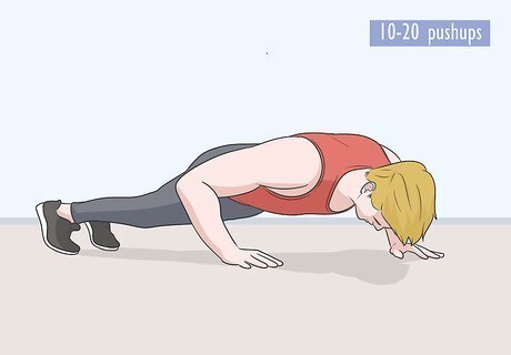 Do 10-20 pushups to make your core and shoulders stronger. Get into a plank position with your arms pushing against the floor, your back straight, and your toes pressing against the ground. Do at least 10 pushups if possible, keeping your back straight and lowering yourself to the ground slowly before lifting your body back up. Extend your arms fully so that they’re straight when you lift up from each pushup. Try doing this in front of a mirror so you can see if your back starts to bend. A strong core will make it easier for you to balance while wakesurfing, and strong arms are helpful in getting on and off the board.