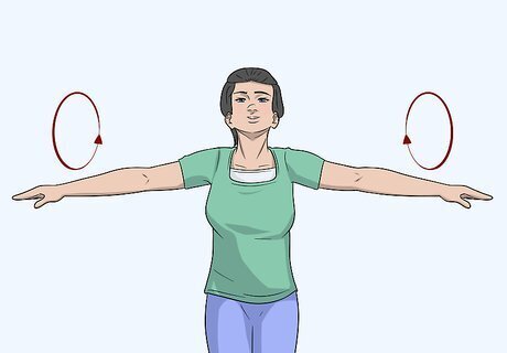 Do arm circles to stretch out your shoulders and arms. Stand with your feet shoulder-width apart and stretch each of your arms out beside you so they’re sticking straight out. Move both of your arms in small circles, switching the direction after 10 or so rotations. Your arms will be important for keeping your balance while wakesurfing, so it's good to stretch them properly. Start with slow arm circles and increase the speed as you do more. Try doing larger arm circles to stretch out your shoulders more thoroughly.