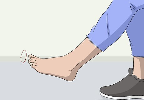 Stretch your ankles by rolling them in circles one at a time. Having flexible ankles is super important for balancing on your board. Stand on one foot and lift the other foot slightly off the ground. Roll the ankle that’s off of the ground slowly in a circle, keeping it lifted the entire time. Once you roll it in a circle 10 times, switch directions and roll the ankle the other way 10 times too. Make sure you stretch out both ankles equally, switching directions in the middle of the stretch. Roll your ankle in a slow, full circle, extending it as far out in each direction as possible while keeping your leg still. Stand with your back straight.