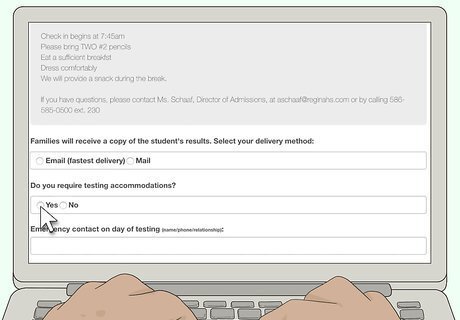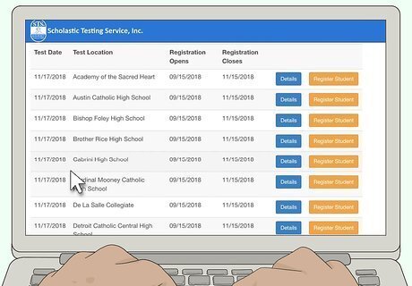 Sign up for the test through your local diocese or school of choice. While the HSPT is offered nationally, registration is local. Contact your local Catholic high school or diocese office to get a link to register for the test. You may also find the registration link on their website. For more information about registering, go here: https://www.ststesting.com/hsp/index.htmlVariation: You can show up on test day without registering and still take the test. However, you won’t be able to request accommodations. Make sure you arrive by 8:30 a.m. to ensure you have time to check in.