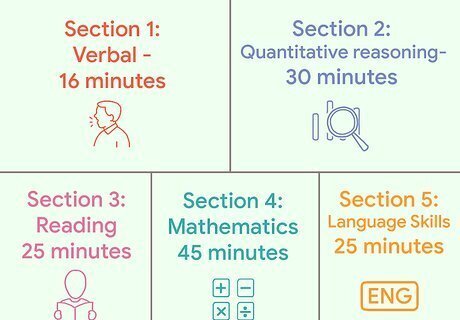 Learn the format of the test so you know what to expect. The HSPT is a standardized test with timed sections. Once the time expires for a section, you can’t work on it any longer, so it’s important to work through each section as fast as you can. The test has 298 questions, and you'll have a total of 2.5 hours to complete it, which means you have an average of 30 seconds per question. Be prepared to complete the following sections: Section 1: Verbal - 16 minutes Section 2: Quantitative Reasoning - 30 minutes Section 3: Reading - 25 minutes Section 4: Mathematics - 45 minutes Section 5: Language Skills - 25 minutes