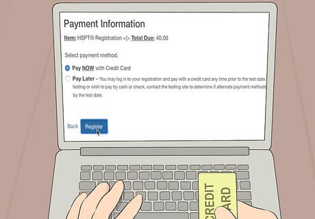 Pay the $40 fee to complete your registration. The cost to take the HSPT is $40, which you can pay online with a credit card. Submit your payment to finalize your registration. You’ll see a confirmation number when it’s complete.