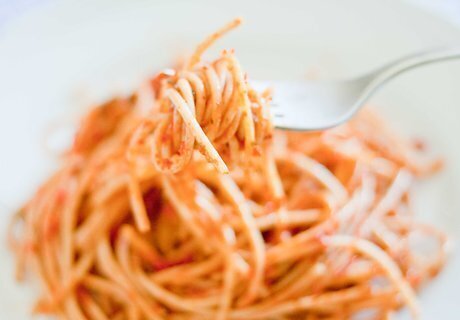 Eat/drink the night before. Consume plenty of complex carbohydrates which will give you long term energy for competition. Foods that are high in carbohydrates include: multi-grain cereals, whole grain cereals and breads, fresh or dried fruit, low-fat yogurt, bagels, pastas, beans, fruit bars, pretzels, vegetables, rice, waffles, pancakes, toast, bread, potatoes. Avoid fatty foods that do not store energy or help keep you hydrated. Drink plenty of liquid (about 16 ounces) to stay hydrated. Water is a great liquid to maintain hydration, and sports drinks like Gatorade replenish electrolytes lost through sweating and give your muscles the carbohydrates they need to keep working hard. Do not experiment with any new or exotic foods that may upset your stomach.