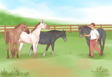 Allow the new horse to figure out its place in the herd on its own. After your horse has become accustomed to being in a new place, let it out into the pasture with your other horses to let it mingle and start to figure out its place. Keep a careful watch for aggressive behaviour, either from the new horse or towards it, and temporarily separate it from the herd if necessary. Make sure the other horses are watching as you bring it into the pasture, as this can help them understand that the newcomer is accepted by you. There is no special way to bring a new horse into the herd. You will simply need to let it loose and keep a watch for the herd's behaviour towards it.