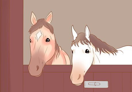 Provide a companion horse or other animal if you do not already have one. Horses are social animals and are more relaxed around other members of the same species. While it is possible to own a horse that is alone, it will be much happier with a companion. If you have other farm animals, it may feel at home being around them, and you will not have to take care of two horses rather than one. Good companion animals for horses, aside from other horses, include large dogs, goats, miniature horses, and donkeys. See how your new horse reacts to these animals and how they react to your horse before you let them be alone without your supervision.