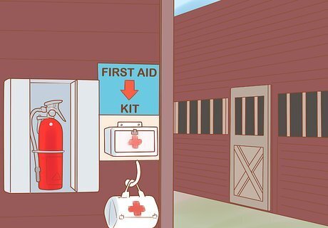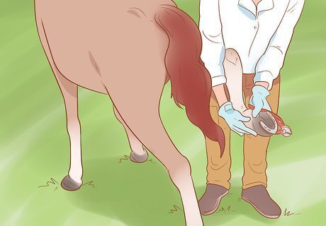 Set up a primary and secondary first aid kit near the stable. The primary first aid kit should be kept in the stable and never moved, to be used for particularly troublesome and dangerous ailments at home. The secondary first aid kit is smaller and contains the bare essentials for taking care of your horse's medical needs in the field. For the primary kit, buy antiseptic spray and wash, fly repellent, cotton wool, a variety of sizes of self-adhesive horse bandages, petroleum jelly, curved scissors, salt for sterilizing water, a thermometer, a bowl, and a worming syringe. For the secondary travel kit, buy a hoof pick, a few horse bandages, antiseptic spray, baling twine, basic human first aid supplies, and phone numbers for nearby vets and horse doctors.