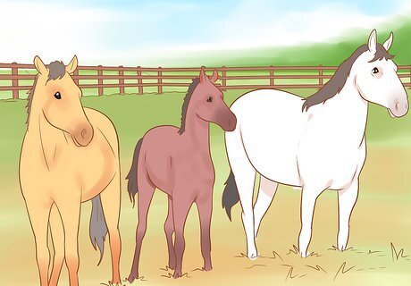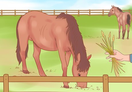 Spread feeding areas around the paddock at least 20 feet (6.1 m) apart. Normally a horse will be comfortable grazing in the pasture at its leisure, but a new horse may feel uncomfortable eating around others for a few weeks. Bring your horses' stable feeding troughs out into the pasture and spread them at least 20 feet (6.1 m) apart. This will encourage your horses to keep their distance from each other until the new horse is comfortable grazing and eating close to others and the herd seems to accept the newcomer. Always allow the dominant horse to eat first, as this will keep the hierarchy balanced until the new horse finds a place for itself. Some horses will become accustomed to the others in your herd almost instantly, but others may take a few weeks or longer. Pay attention to your horses' eating habits and the new horse's behaviour as it feeds among others.