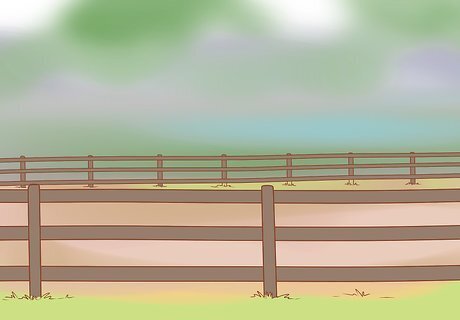Erect a circular fence with a gate at least 1.5 m (4.9 ft) high around the pasture. Horses are tall and can easily vault a low fence. Put up a reinforced wooden fence in a circular shape around the pasture at least 1.5 m (4.9 ft) high. If your horse is particularly tall, make the fence at least as tall as your horse's shoulders are. Do not put in right angles and instead opt for a circular fence plan, as a horse may be unaware of corners while running. If you have multiple horses, it is especially important to have no corners in the enclosure, as a horse could get bullied into the corner by aggressive horses with no route for escape.