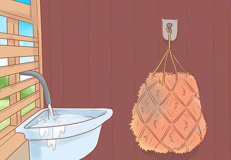 Set up a feeding and water area in the stable with a trough and a haynet. Buy a feeding trough and a water trough to keep in your horse's stable, so it can snack and drink at its own leisure. Alternatively, you can buy a haynet to keep the hay and feed above the ground, which can make hay last longer and can be much more convenient for your horse as it doesn't have to bend over to eat.