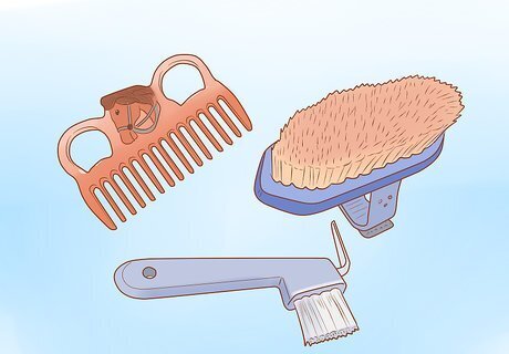 Gather grooming supplies, including a hoof pick, comb, and brush. Taking care of your horse through grooming is important to maintain its health and its happiness. Buy a curry comb, a dandy brush, a body brush, a hoof pick, and a polishing cloth or large towel to effectively groom your horse and keep it looking and feeling fresh. Store these supplies in the stable for easy access. A curry comb has rubber teeth, a dandy brush is stiff while a body brush is soft, and the towel will clean up sweat and make the horse look nice and shiny after grooming. Opt for plastic bristles when you can, as these are less likely to break in the horse's coat than natural hairs or other fibers.