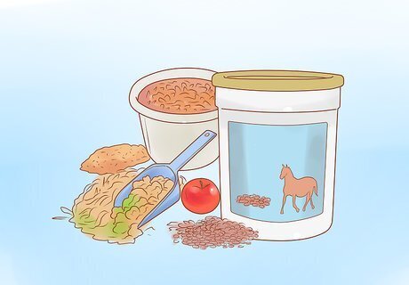 Buy horse feed and snacks, such as quality hay and grains. Horses need to eat "roughage," meaning natural fibers such as grass, as the main part of their diet out in the pasture, but having some snacks and hay for the stable will make regular feeding easier for you. Most horses do not need grain, as it is for horses with high energy requirements, such as performance jumpers or racehorses. If your horse has trouble keeping weight, talk to your veterinarian and consider adding some to its diet. You can buy horse snacks like apples and carrots at the grocery store, and specialty grain mixes and hay at animal supply stores and tack stores.
