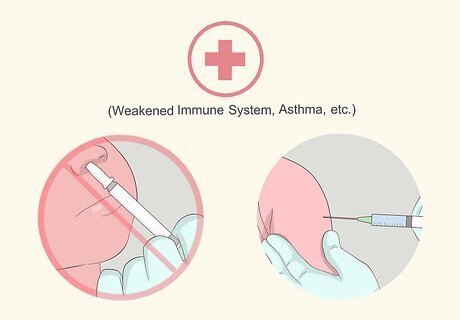 Let your pediatrician know if your child has certain health conditions. Some medical conditions can affect which forms of the flu shot your child can receive safely. For example, the live flu vaccine (usually delivered as a nasal spray) may not be safe for children with weakened immune systems. Children between the ages of 2 and 4 who have asthma also should not have this form of the vaccine. Tell your pediatrician if you have any health concerns, and ask them which type of flu vaccine is safe for your child. Most forms of the flu vaccine are considered safe for children with egg allergies. If your child has severe egg allergies, their pediatrician may wish to observe them in the office for a while after they get the shot to monitor for any reaction.