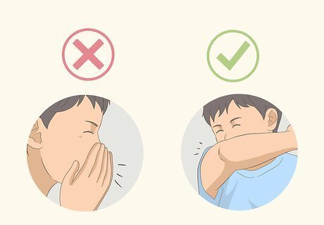 Cough or sneeze into your elbow and encourage your child to do the same. Coughing or sneezing into your hands is a great way to spread germs from person to person through hand contact. By sneezing and coughing away from your hands, you're less likely to spread germs.