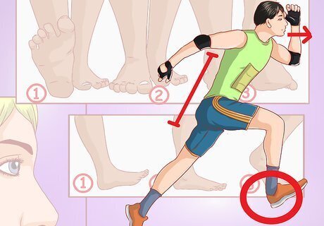 Run with the right form. You'd be surprised how much the way you run affects whether or not you'll end up with an injury. Make sure you aim to run with correct form to prevent any possible injuries in the long run. First, run with good posture. Your torso should be straight and your neck and head should be straight and facing forward. Your arms should hang loosely at your sides in a comfortable position. Swing them back in forth in tandem to your stride. As for your feet, you should run heel to toe. Land on your heel and roll forward so that you end up pushing off with your toes. Also try not over stride (where your foot lands far ahead of your knee) as this causes additional wear and tear on the joints and muscles.