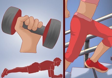Strengthen your core and leg muscles. You might not think that strength training is an important part to running or to preventing running related injuries. However, this is an essential form of exercise needed to prevent injuries. Strength training helps prepare your muscles and body for running. When you run there are a variety of muscles that are activated. If one or more aren't strong or they're unequally strong, this can lead to injury. Work on strength training to make sure each muscle group needed for running has been equally strengthened and worked. This prevents some muscles from getting overworked. Strength training should focus on: strengthening the back of the legs, the knees, the glutes and the core.