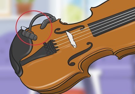 Clip the microphone to the side of your violin. Your violin microphone will come with a clip that attaches to your violin near the chin rest. Adjust the clip to fit on your violin and secure it in place. Point the microphone at the violin strings or at the f-hole to capture the sound of your instrument. Each violin will sound different when it’s attached to a mic. Experiment with the positioning of your microphone to see what produces the best sound.Tip: Some microphones and pickups attach underneath your violin’s fingerboard. Place the flat side of the microphone against the violin’s body and slide it underneath your fingerboard. The foam on top of the microphone will hold it in place.