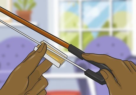 Apply rosin to your bow to create a fuller sound. Rosin helps your bow grip the strings and makes them vibrate more to improve your violin’s sound. Rub the strings of your bow across your rosin to give it an even coat. Try your bow after applying the rosin to see if your tone improves. You can buy rosin at music supply stores. Too much rosin on your bow can make your violin sound scratchy. Keep using your boy until the rosin wears off. Make sure to wipe any rosin buildup off of your strings when you’re finished playing.