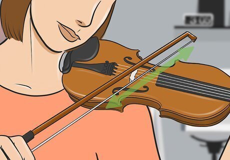 Use faster strokes to make the violin louder. When you’re playing, increase the speed of your strokes to make the strings resonate faster. Practice starting your stroke slowly and speeding up as you near the end to hear the change in volume. Experiment with the speed of your strokes to see what dynamics you can achieve. Change the direction of your stroke quickly to create a loud spike in your sound.
