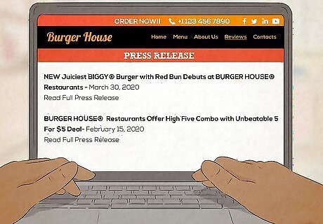 Get the word out about your new product in local newspapers. First, brainstorm what makes your product new or interesting. Ask yourself what you think is most appealing about your product, and what will excite journalists to cover its release. Once you start writing, make every word count. Keep the announcement brief at about 300-400 words maximum. Email it to any news organization in the area you think might be interested. If your product is available online and you have some budget to spend, consider using the help of a press release firm. They can write articles for you and post them on hundreds of relevant news sites. Make the first line of your press release clear and to the point to get journalists' attention. If your ice cream shop is giving away free ice cream to promote your new menu, write something like, "Ice cream shop will give free ice cream to first 100 customers next month."