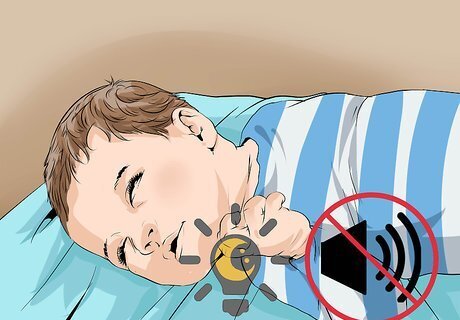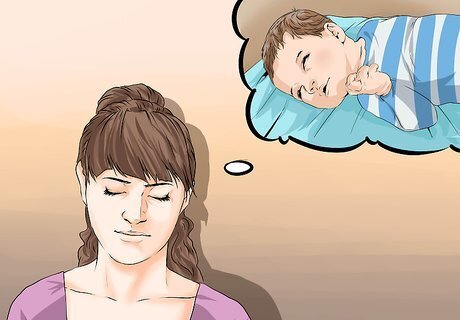 Give your baby a chance to fall asleep on his own. Put him down when he is drowsy, but before he falls asleep. Most babies will fuss for a bit before falling asleep. If your baby is a few months old, wait about five minutes before responding to crying. It's easy to get into the habit of singing, rocking, or nursing your baby to sleep, but realize that these may become sleep crutches that the baby completely relies on to fall asleep. When you do go in to calm your baby, keep the room dim and be quiet. Calm your baby by a soothing touch, feeding, or walking around holding him. Place him back in the crib or bed when he's calm and let him fall asleep on his own.