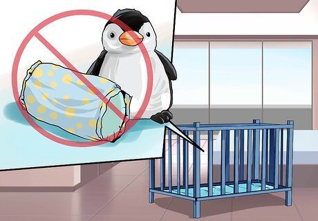 Keep the crib or bed free of blankets, pillows, and toys. Babies can overheat or suffocate if the crib is full of soft materials that block the baby's face, especially if she hasn't learned to roll over yet. Your baby should sleep in a crib or bed that has a firm mattress and a clean fitted sheet. Don't put any blankets, pillows or soft toys in it. You should also avoid using crib bumpers which can suffocate, entrap, or strangle a baby. Most health authorities recommend against using them.
