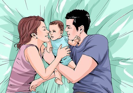 Learn how to co-sleep safely. If you're breastfeeding and would like easy access to your baby at night, you might be considering co-sleeping. To co-sleep safely, place the baby next to you on a firm mattress, but make sure that there's a guardrail preventing the baby from rolling off of the bed. Choose one without slats to keep the baby's limbs from getting stuck in the rail. Always put the baby down on her back and make sure everyone in the bed has enough room to move. Be aware that even when done safely, studies show that babies who co-sleep are at higher risk of SIDS than those who sleep in their own crib. The American Academy of Pediatrics recommends against bed-sharing. To avoid dangerous co-sleeping situations, avoid: Placing the baby in the middle of the bed between both parents. Co-sleeping if you're on medications, have been drinking, or are exhausted. Co-sleeping if you're obese. Co-sleeping on a soft surface like a couch or waterbed. Co-sleeping if you're not the baby's mother or father since you're probably not as attuned to when the baby rouses.