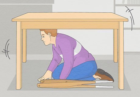 Cover your body. Hide underneath a table or desk if you are close to one when the earthquake starts. Use surrounding items such as couch cushions to cover as much of your body as possible, as earthquake movement is unpredictable and can cause many things to fall from the walls or topple over onto the floor.