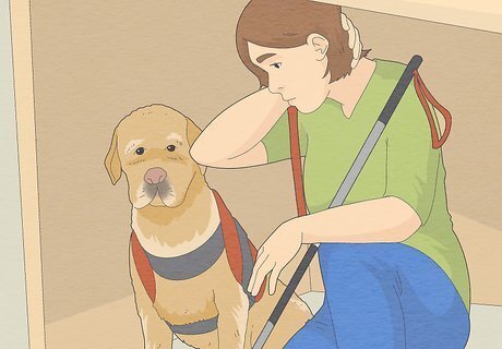 Keep your service animal close. If you have a service animal with you, keep it close by your side. Tell your pet to “sit and stay.” Remember that your animal may be scared and unsure of what is going on, so keep it calm by petting its body and using a soft, reassuring voice to give commands.