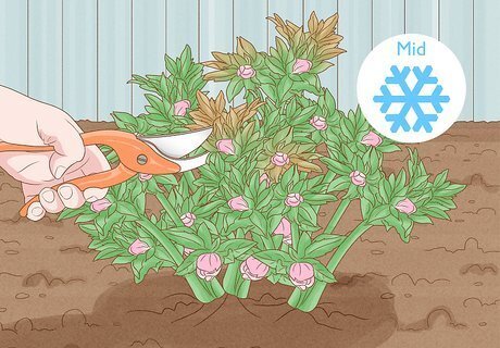 Prune your plant in mid-winter. Wait until mid-winter to prune your plant (the new flower buds should just be forming at this time). Cut the old foliage that is growing around the outside of the plant all the way off at the base. These old leaves are usually unsightly and can harbor bacteria and fungal spores that can infect winter rose plants. The new leaves that grow up from the center will open and spread out as they grow. Always remove the old leaves from the garden after pruning.