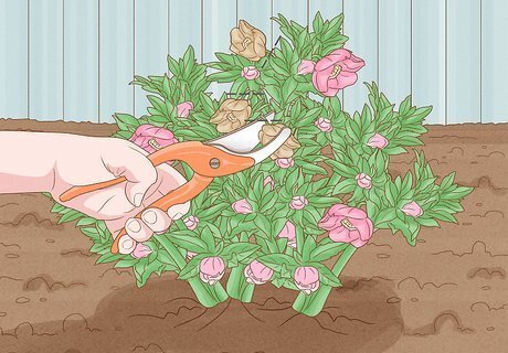 Deadhead your flowers. In order to avoid unwanted seedlings, prune off the flowers as they begin to fade or die. This type of pruning is commonly called deadheading. Deadheading also helps the plant put its energy towards new blooms, rather than trying to keep the old blooms alive. Cut the stems all the way off at the base. Any flowers that are left on the plant will drop seeds onto the soil and new seedlings will emerge around the parent plant the following spring.