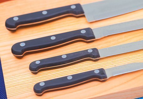 Decide whether you will purchase individual knives or an entire set. While there are pros and cons of each, you need to primarily use your budget and knife needs to decide. If you only use a few knives on a regular basis or have a limited budget, buying knives individually will save you money and give you more control over quality. You'll also save space from not having to store knives that you never use. If your budget allows and you need a variety of knives, buying a set makes sense. Most knife sets include a utility knife, bread knife, carving knife, paring knife and chef knife. Some knife sets also come with a storage block and a steel for sharpening the knives.