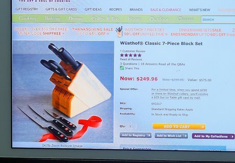 Determine the best place or source to buy your knives. If you choose a store in your area, consider whether they'll be running sales in the near future. If you use an online site, don't forget to figure shipping costs into your purchase. Regardless of where you choose to buy your knives, learn the company's return policy.
