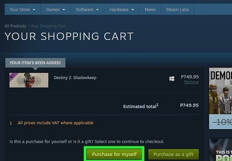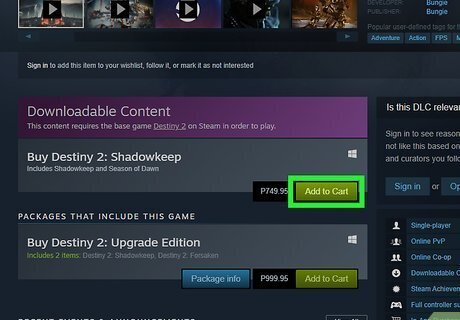 Click Add to Cart under "Buy Destiny 2: "Shadowkeep" or "Buy Destiny 2: Upgrade Edition." You can see what each purchase includes under their titles. For example, the first "Buy Destiny 2: Shadowkeep" includes Shadowkeep and Season of Dawn for $34.99. You'll be directed to your cart that includes everything you're purchasing.