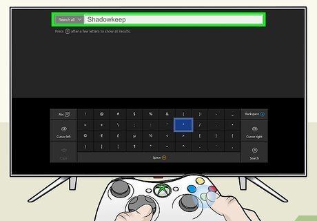 Search for "Shadowkeep." Using the on-screen keyboard, type your search. Navigate to the letters you want to type and press A.