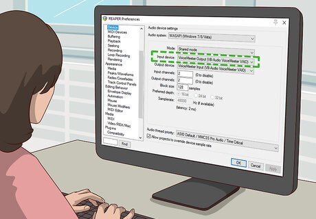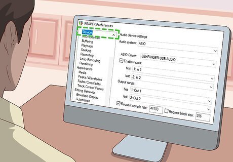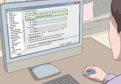 Select your audio interface as your input device. On Reaper, use the drop-down menu next to "Input Device" to select your audio interface. If you don't see your audio interface in the drop-down menu, first make sure it's plugged in. Then click ASIO Configuration and click the bar next to your audio interface (and all other devices) to make sure they appear in the drop-down menu.