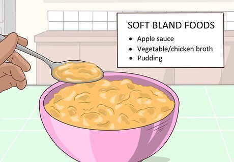 Have soft, bland foods. Bland foods that are soft and easy to swallow are the best options post-surgery. Have applesauce, vegetable or chicken broth, baby food, baby rice, and pudding. You can also have soup, such as a blended vegetable soup. Go for foods that will provide nutrients and energy, without irritating your throat. Avoid acidic, spicy, and crunchy foods, as they can cause pain and bleeding. You can also try sucking on ice pops to help soothe the pain. If you are in a lot of pain after the tonsillectomy, you may need to arrange for someone to help you prepare food for you for the first several days. Ask a friend, partner, or roommate to help you.
