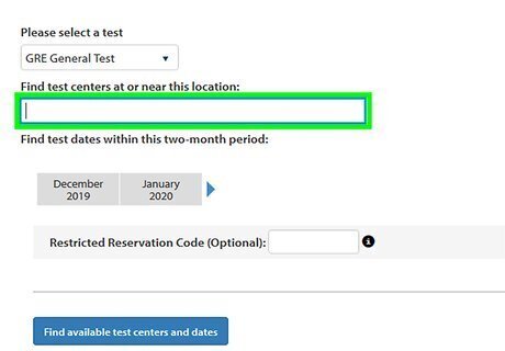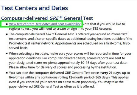 Click a date and testing center to view the available time slots. Once you’ve set the timeframe, type of test, and location, hit the “View Testing Locations” button to proceed. A calendar will pop up on your screen. Click the day that you want to take the test. Then, you will be provided with a map and a list of testing sites. Click a testing site to pull up the time slots they have available.Warning: You cannot walk into a testing center and simply take the exam. You have to show up at your scheduled time. If you are late, you will not be allowed to take the exam. Select a testing site that’s convenient for you. If you’re taking a specialized version of the GRE, you may not have a ton of choices. Less popular versions of the test are only administered in specially-designated test centers. You must show up 30 minutes before your test is scheduled to complete the sign-up process.